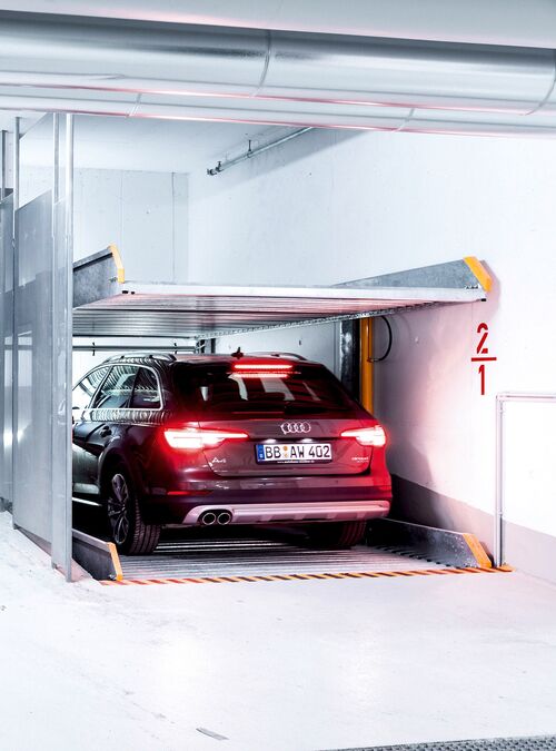 The hidden parking lifts 461-463 allow the construction of parking spaces everywhere, where there’s no space for garage buildings or they simply don't fit in with the overall architectural look.