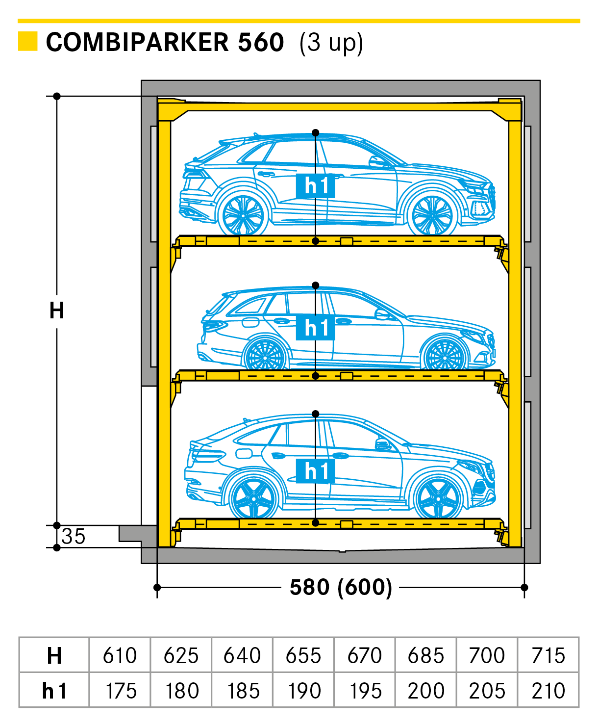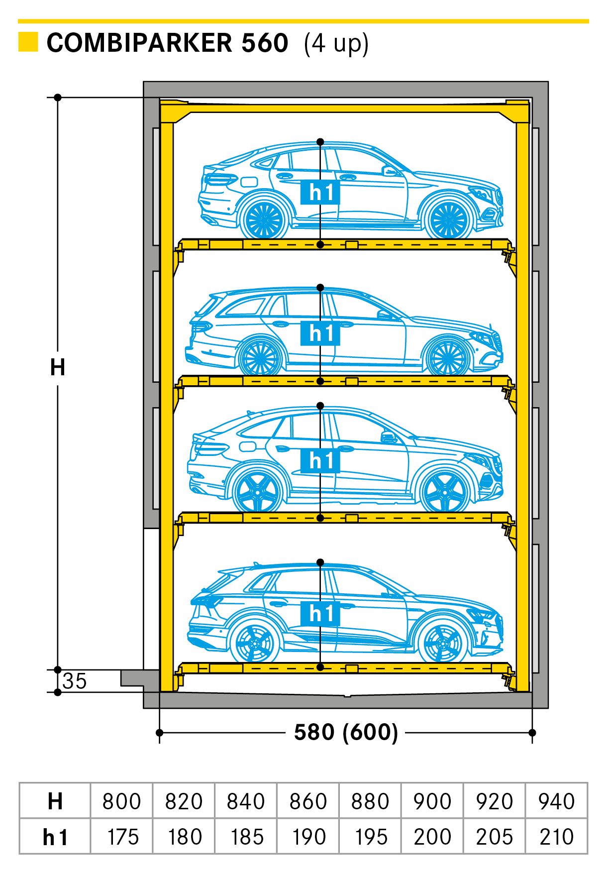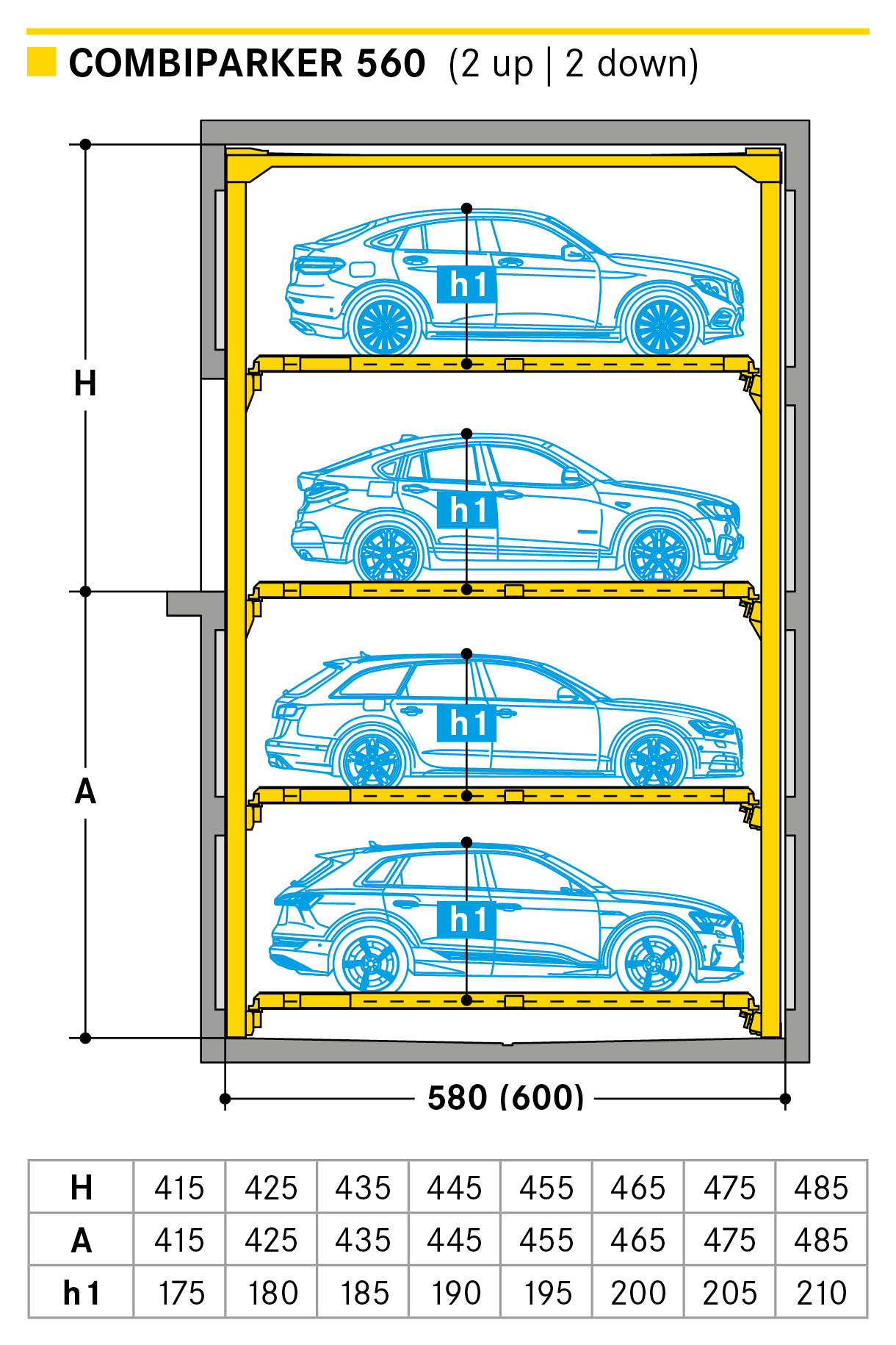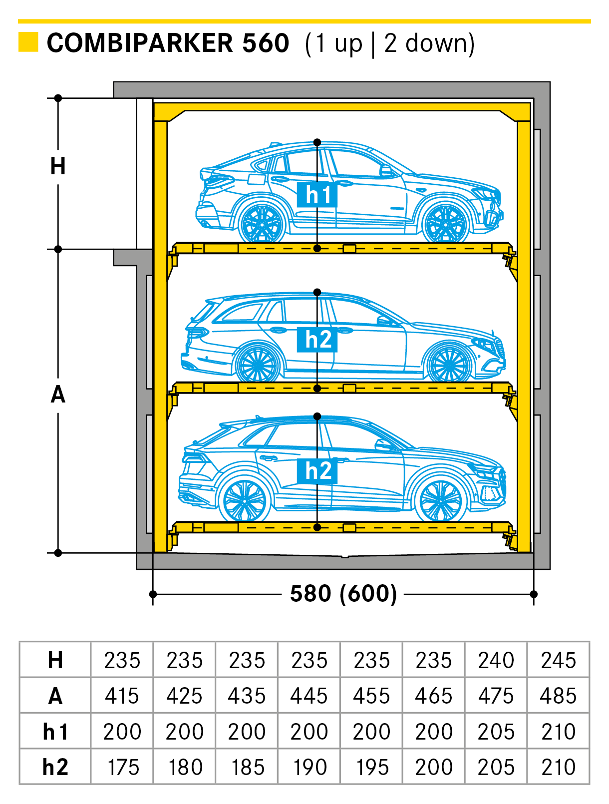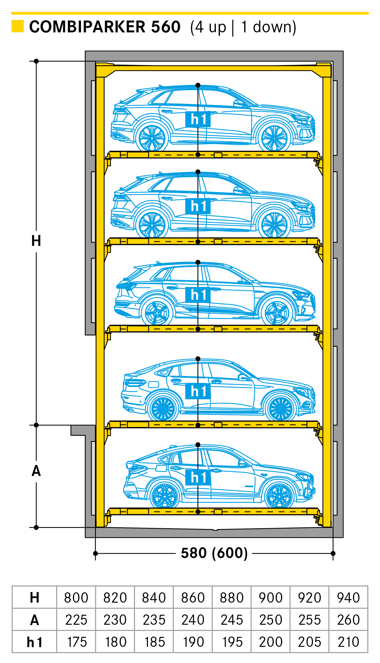 The Combiparker 560 provides up to 5 parking levels which can be designed with complete flexibility with 4 levels up or 4 levels down from the entrance level. The special feature of the new Combiparker 560 is that with a standard underground car park floor height of 2.50 m, up to 4 levels below may be made accessible.