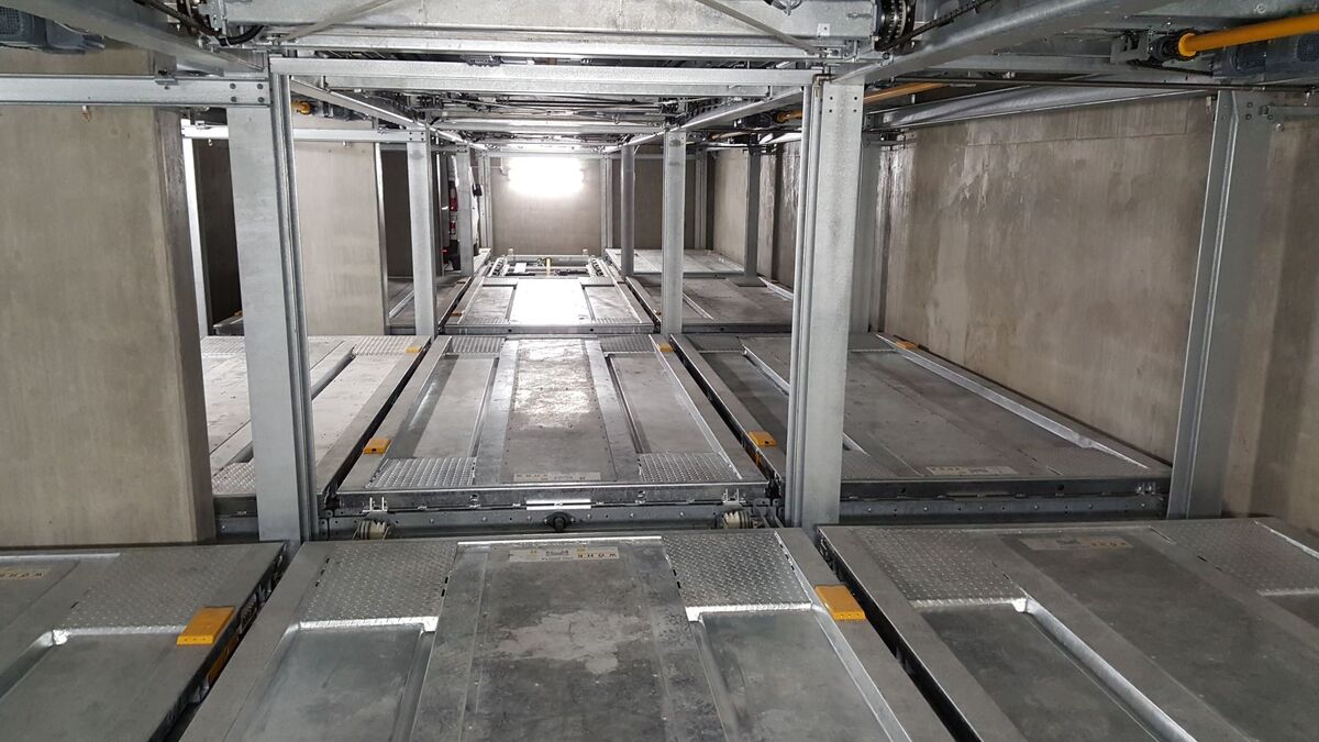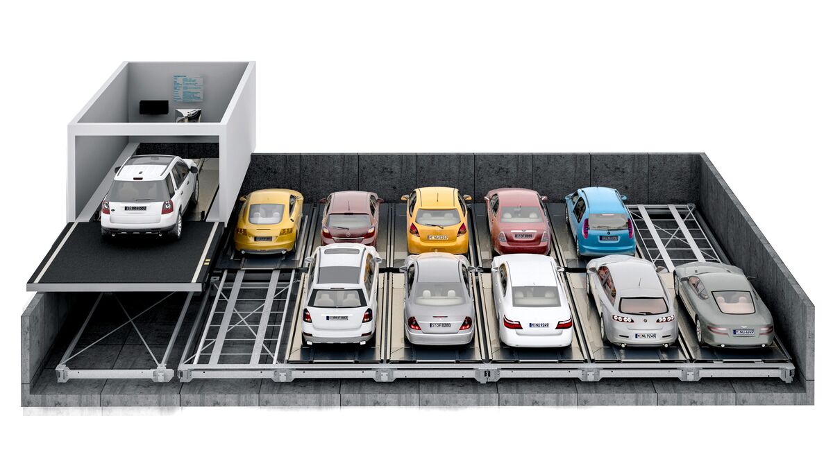 EV-Charging on parking platforms: In the fully automated system Levelparker 570 cars are slided and glided closer together in a way like a puzzle.