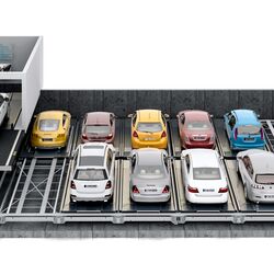 The fully automatic parking system Levelparker 570 for 10 to 50 cars on up to 5 levels above each other and 2 to 6 platform rows behind each other. The Levelparker 570 provides space-saving parking by moving the cars closer together on one or more levels. At each level the cyle movement for transporting the cars takes place by longitudinal and transverse shiftign of the platforms. A vertical lift connects the transfer area with the parking levels which can be arranged either above or underground. Integration of a Turntable is possible to have the car in forward direction when parking out.