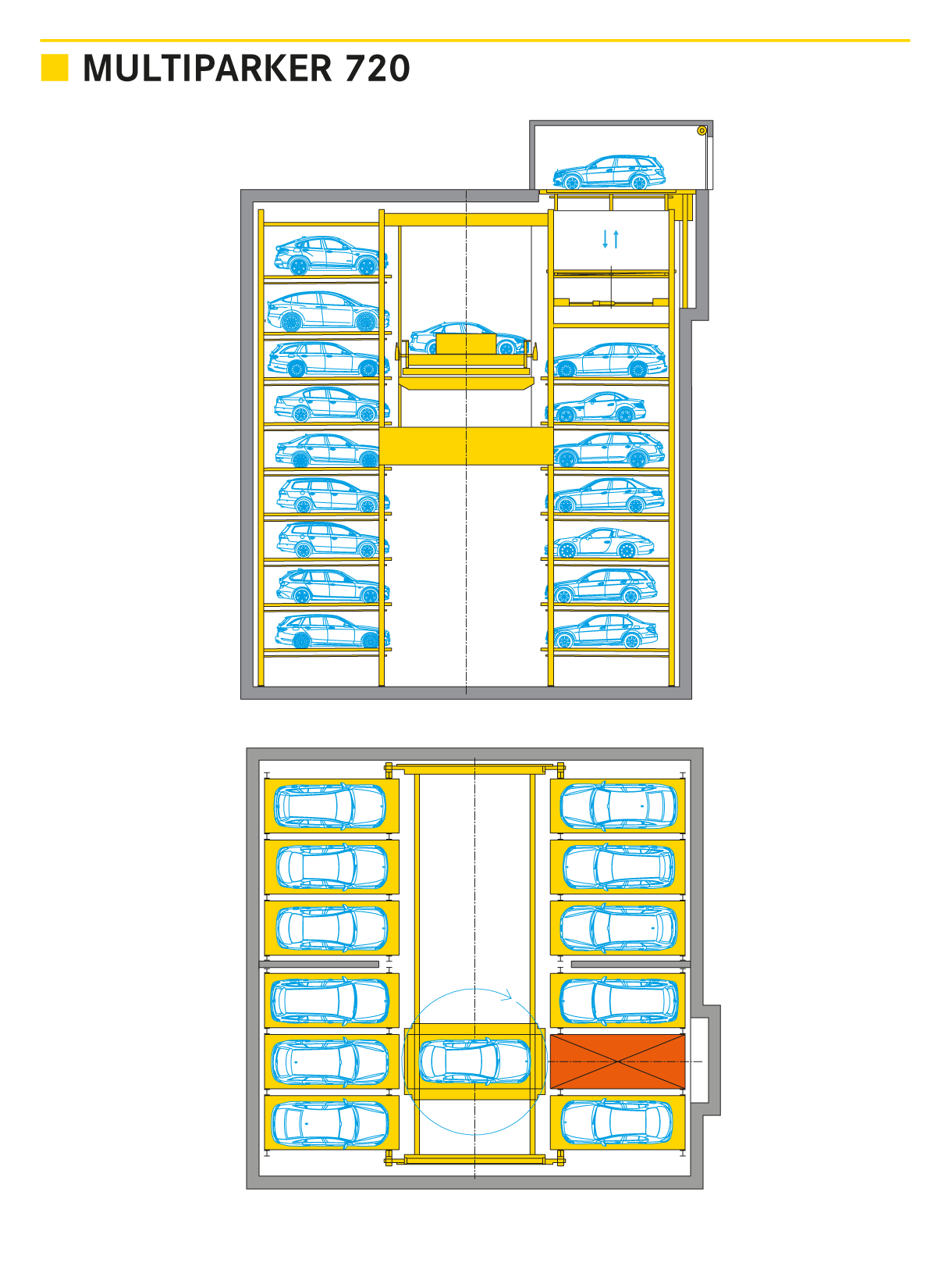 The Multiparker 720 offers space saving parking in a structure similar to a high-rack shelving system and is particularly suited for smaller floor plan areas featuring high structures. Car transport is arranged crosswise. It is possible to provide the Multiparker 720 with a Turntable unit which simultaneously during transport and lifting, turns the car into the exit position.