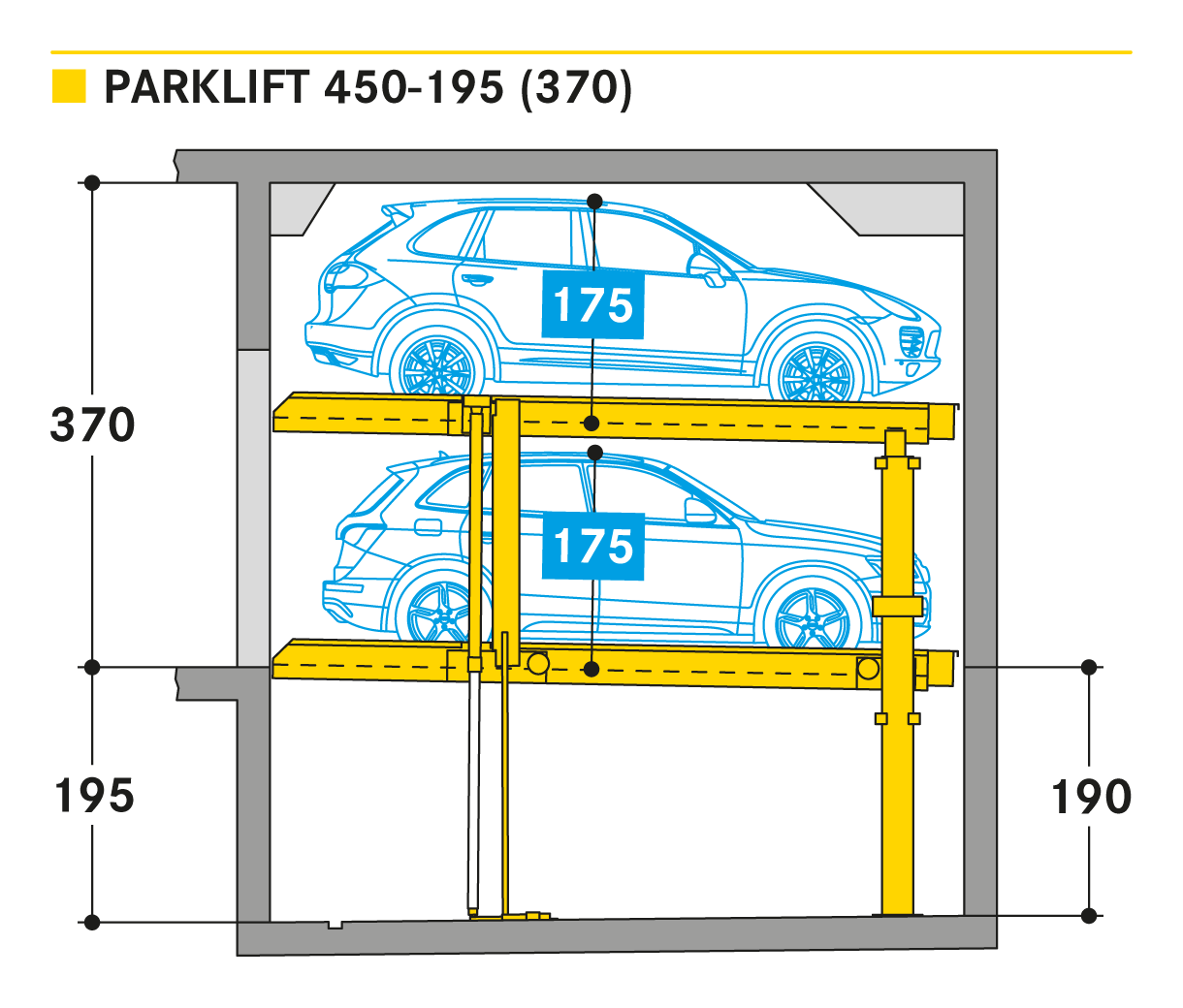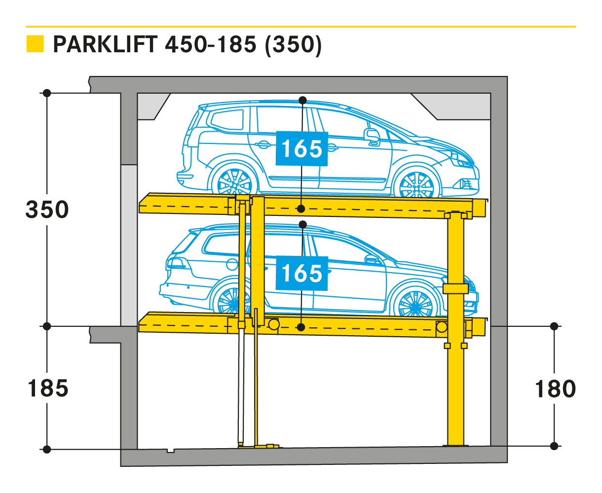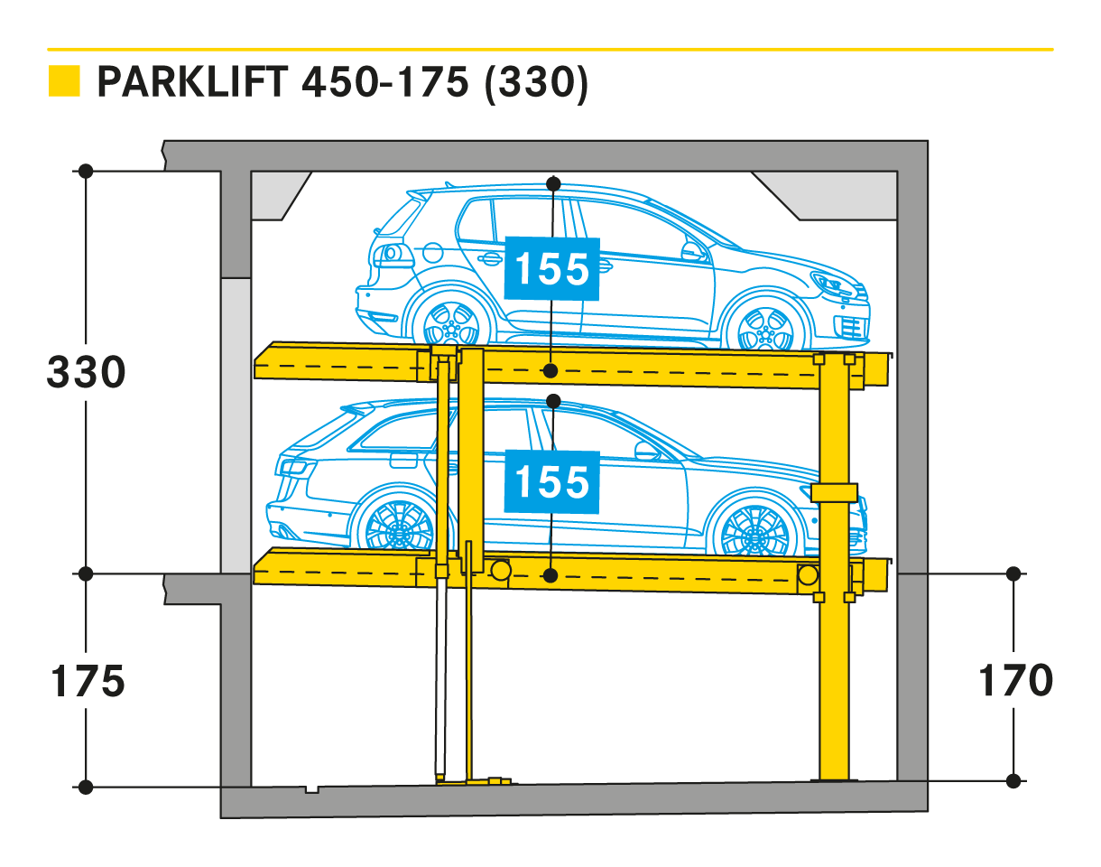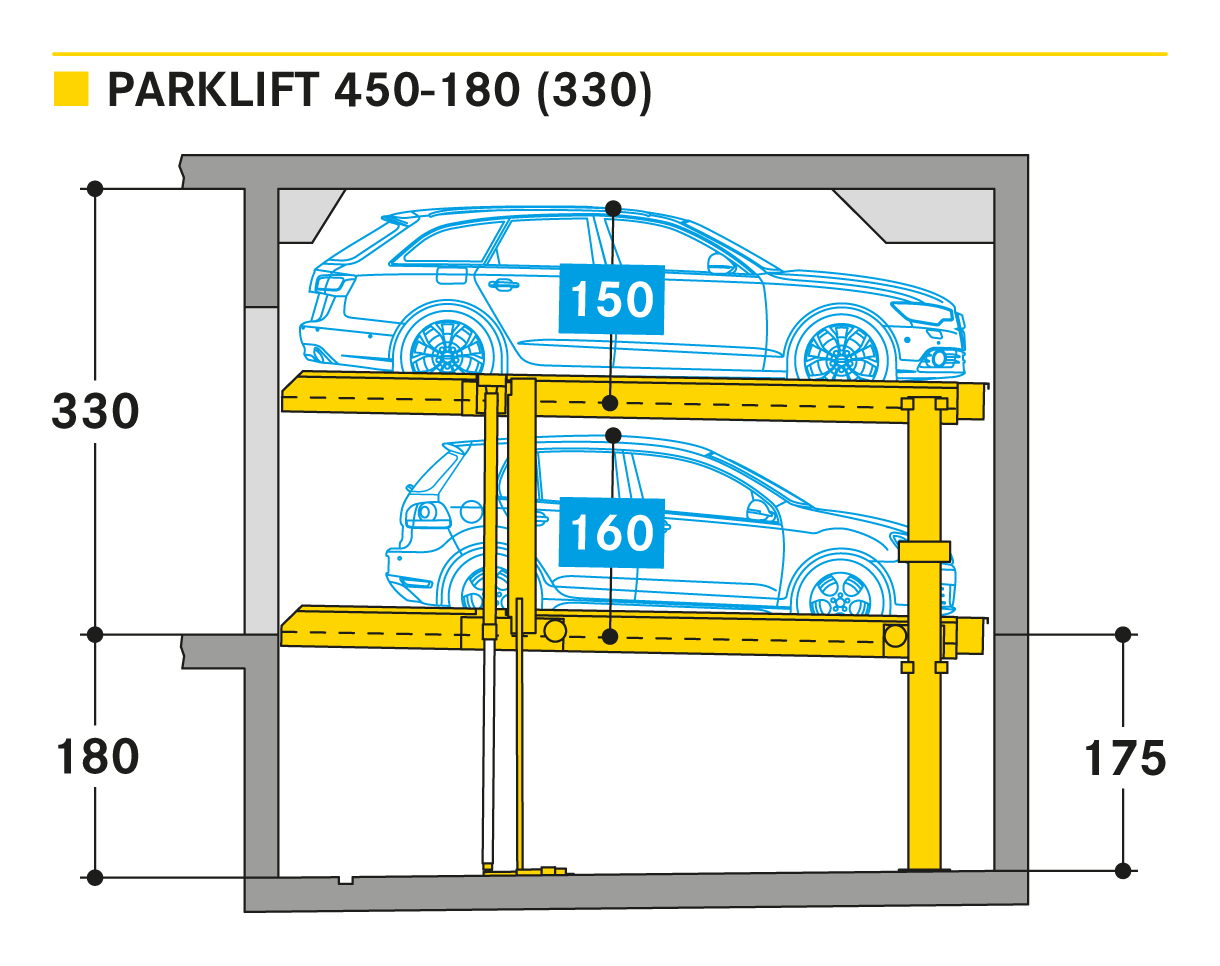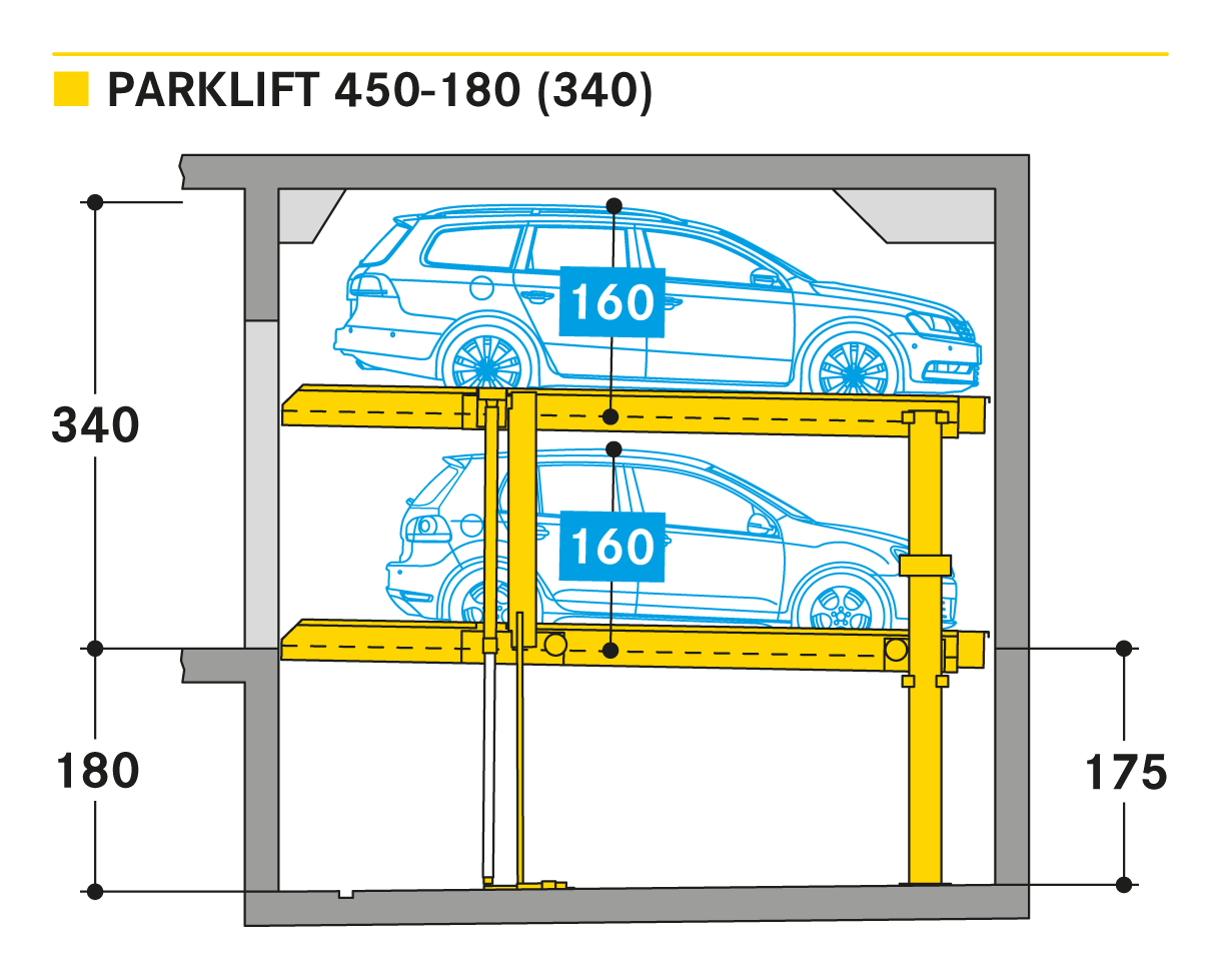 The ´Parklift 450´ also offers maximised installation dimension flexibility. Here the trend is to shift away from the rigidly set, 15 cm clearance increments in as far as the pit-depths are concerned and to move toward increased clearance flexibility. In fact, the newly designed pit depths provide for 5 cm clearance increments. Compared to predecessor models, the Parklift 450 furthermore features a clear ceiling height that is 5 cm less, without any reduction to the usual vehicle heights. How does this come about? The previous models feature an elevated platform for drainage of the water accumulating in the relative parking spaces, where the water drains down from the platform into drainage channels. The newly developed systems have done away with the elevation and have resolved the drainage issues by slightly sloping the platform giving it a minimal, 2 % inclination. The single systems are engineered for 2 cars, the double systems for 4 cars.
