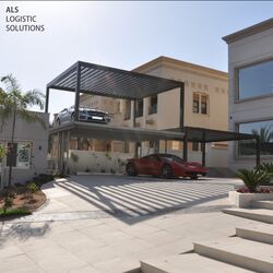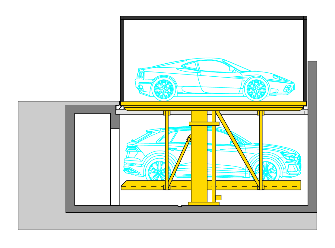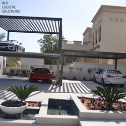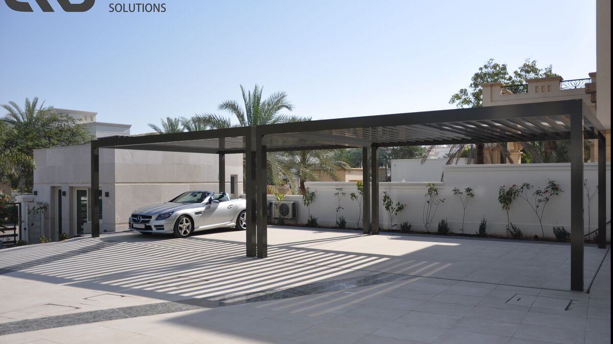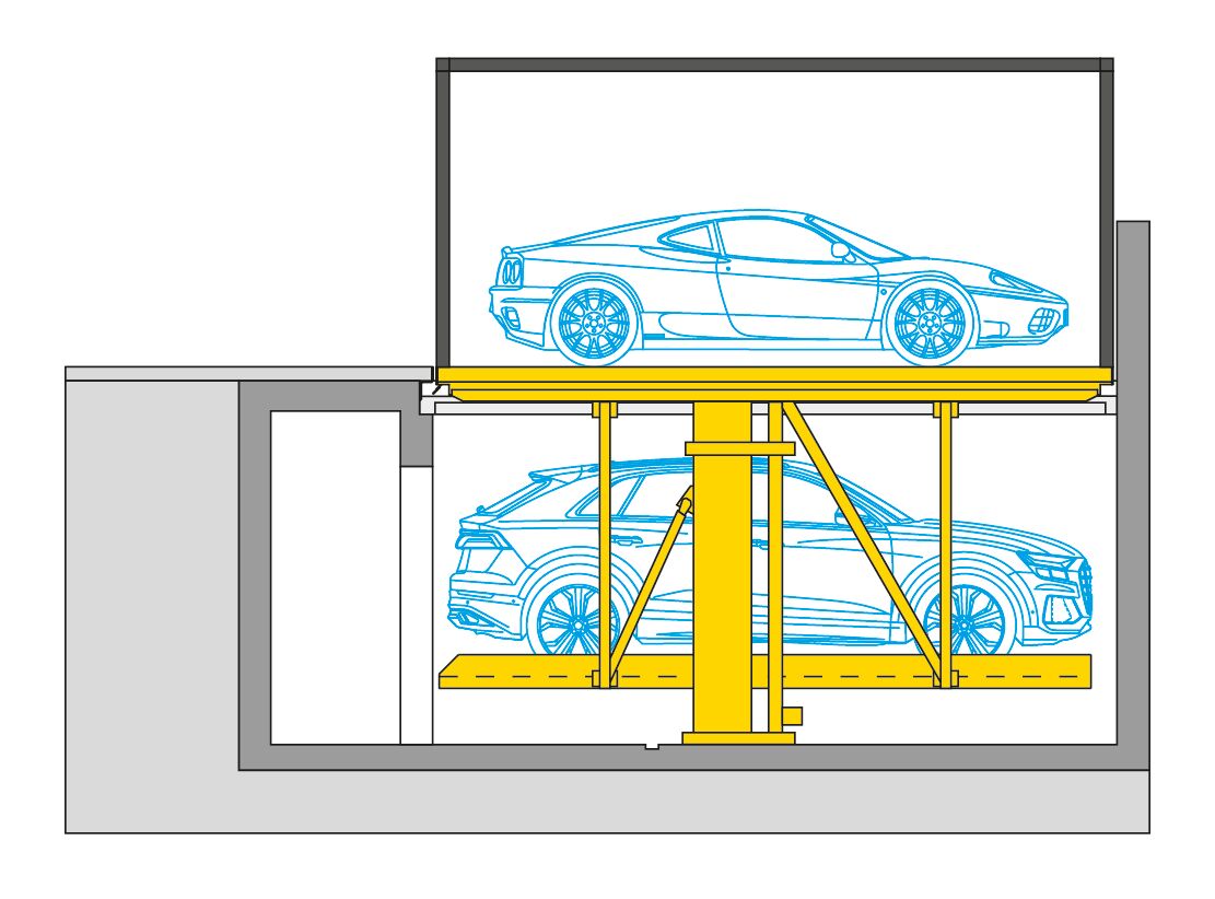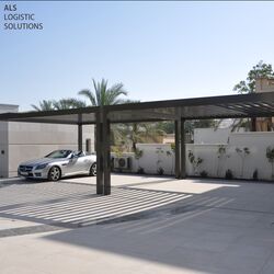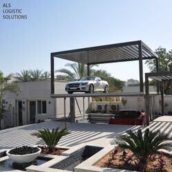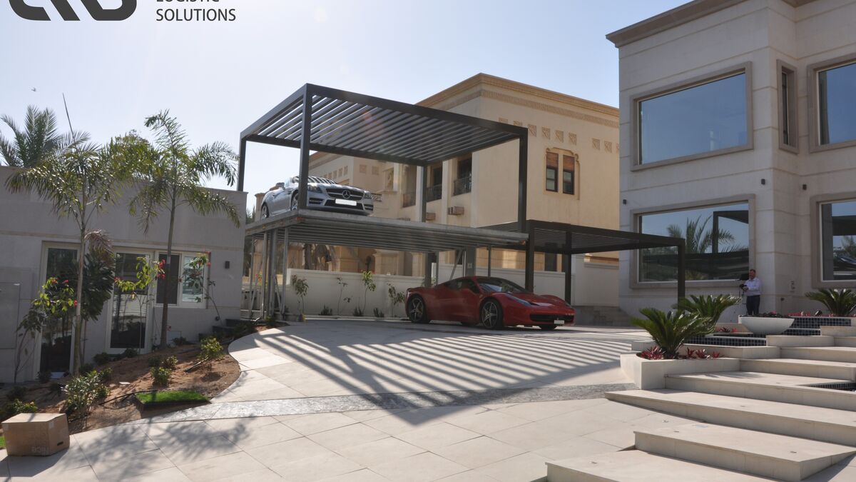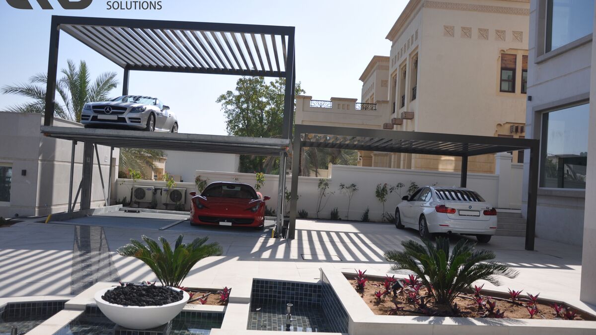 Underground parking space with additional sun protection from above is a good idea in Dubai City. It regularly gets above 40 degrees there from April to September. In this construction project, locally constructed carports were positioned at right angles next to the entrance of the villa. This not only allows the residents to enter the house in just a few steps, but the carports also benefit from the shade of the house for several hours each day. The carport columns sit on the cover plates of two WÖHR 461-2.6 D Parklifts, which are positioned next to each other. This provides space for up to eight vehicles in the small courtyard. In order to safely hold the additional loading capacity of the carports, the Parklift version with 2,600 kg maximum platform loading was selected.