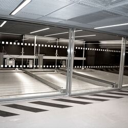 The underground car park facilities radiate an overall glossy ambience, reflected from the lighting system embedded along the driving aisle walls and in the ceiling. The colours used for this Combilift system are adapted to the colours in use in the conventional underground car park.