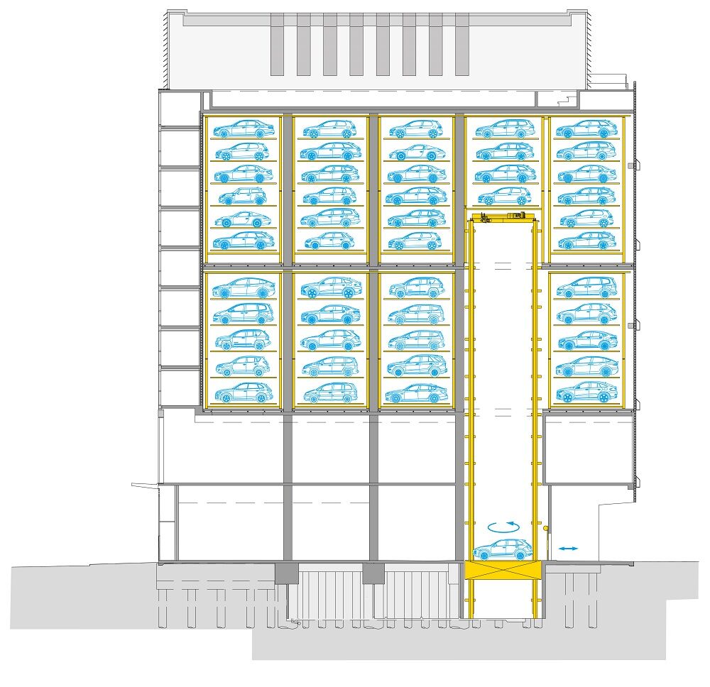 The special of the skytower: Our parking system, which is able to do 30 - 47 parking operations with two transfer cabins. The Multiparker 740 stacks cars with heights between 160 and 200 cm on 11 levels. The complete height of the storage section is approx. 25 m and starts from approx. 12 m above ground level. The parking procedures are operated with a RFID-Chip at the control panel which is located near the transfer area.