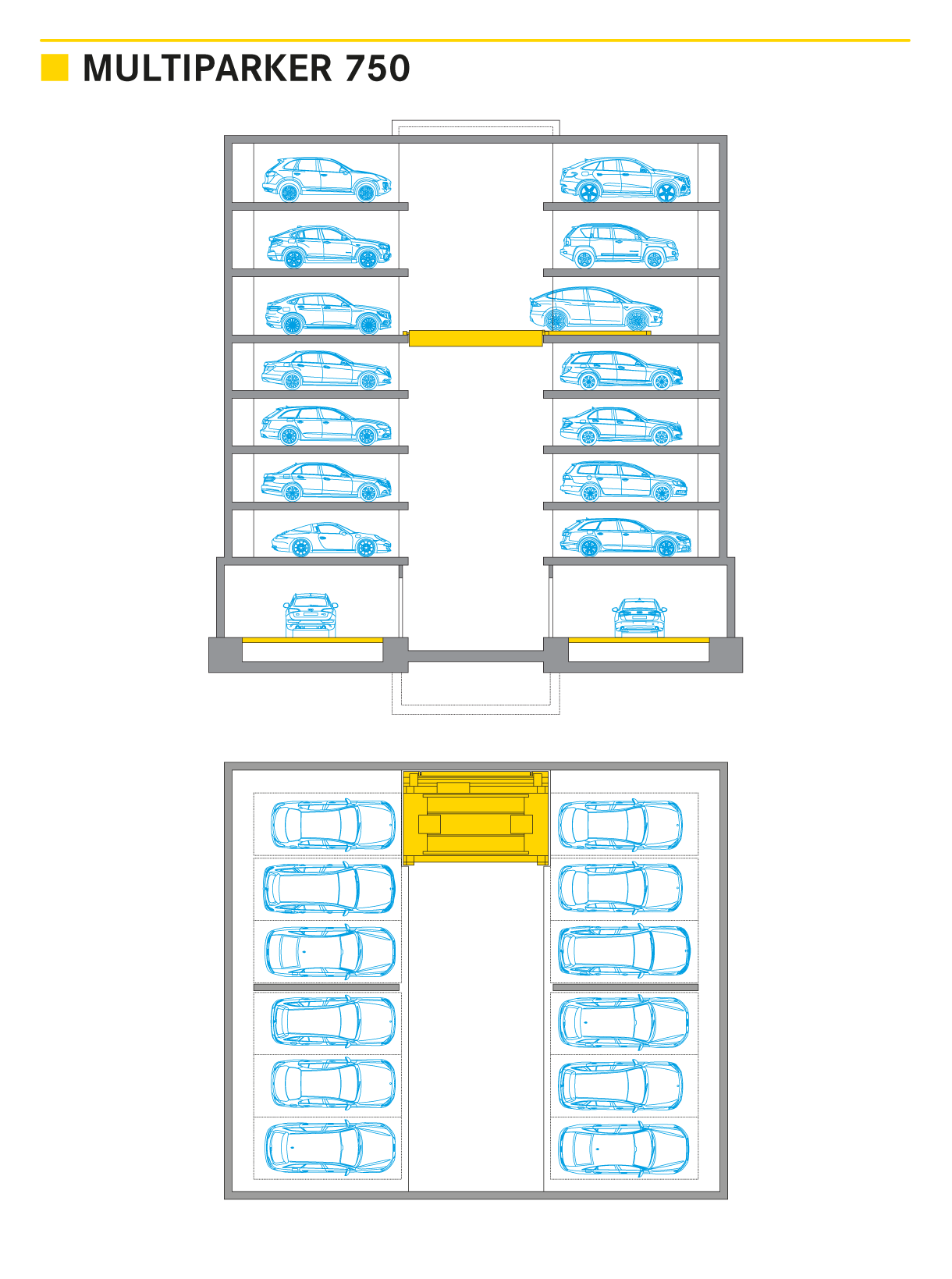 El Multiparker 750 permite el almacenamiento de coches en altura, en torre o subterráneo, de gran capacidad y ofrece lugares de aparcamiento directamente sobre losas de hormigón. Esto hace que, sobre todo los proyectos subterráneos, sean económicamente más viables y aún en solares con un espacio muy reducido se puedan diseñar hasta 30 niveles de aparcamiento. Una o varias cabinas de acceso proveen la entrada y salida del sistema. El sistema de aparcamiento es atendido mediante tecnología de Elevador/Shuttle. Cada nivel de aparcamiento tiene uno o más shuttles dedicados, que no cambian de nivel. Estos shuttles cuentan cada uno con un sistema robótico LAT que recibe y/o deposita los coches directamente sobre las losas. Los elevadores verticales independientes transportan los coches desde las cabinas de acceso a los diferentes niveles y de regreso. Los coches se colocan sin ningún mecanismo o estructura adicional sobre losas de hormigón convencionales. El sistema robotizado no tiene posibilidad de dañar el coche, ya que solamente entra en contacto con sus ruedas. Este sistema puede ser de gran capacidad sin dejar de garantizar tiempos cortos de acceso y operación.