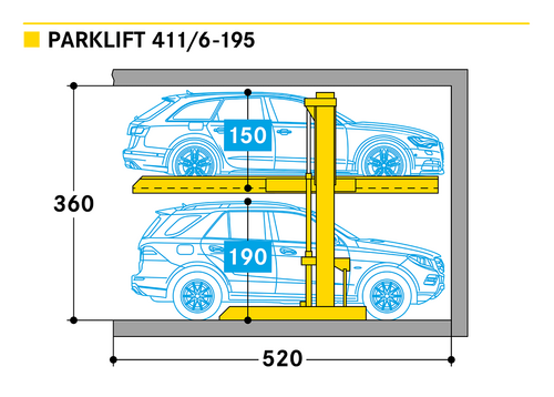Dependencia significa: para poder tener acceso a la posición superior del sistema, se debe retirar el coche del nivel inferior. Con un equipamiento adicional, el sistema Parklift 411 se puede colocar directamente a la intemperie. Unidades sencillas para 2 coches.