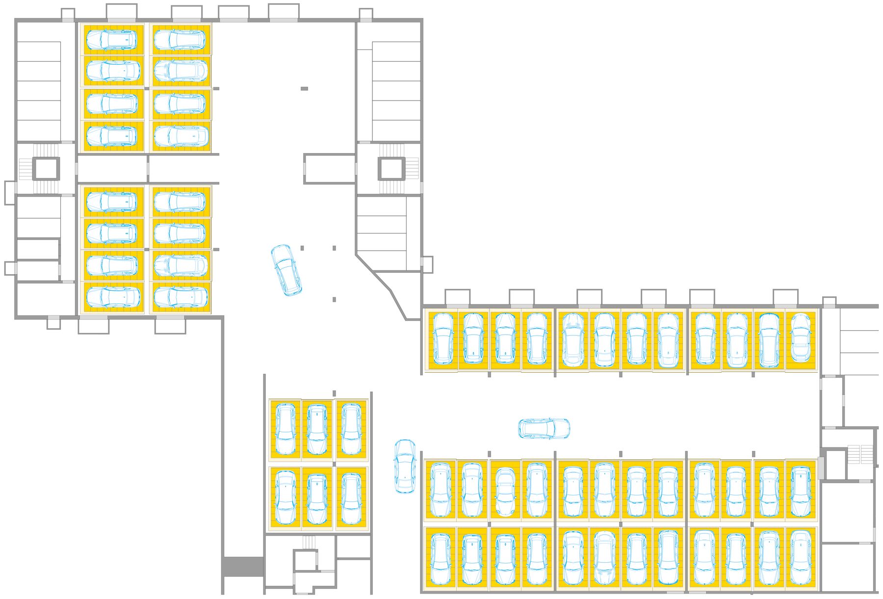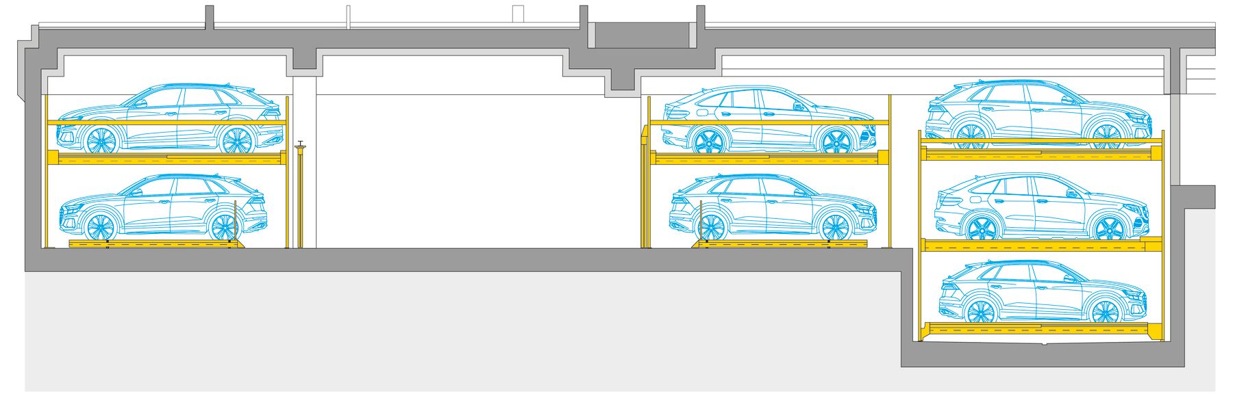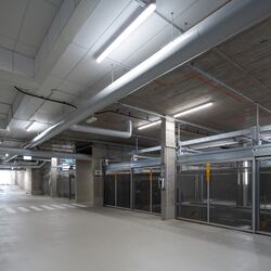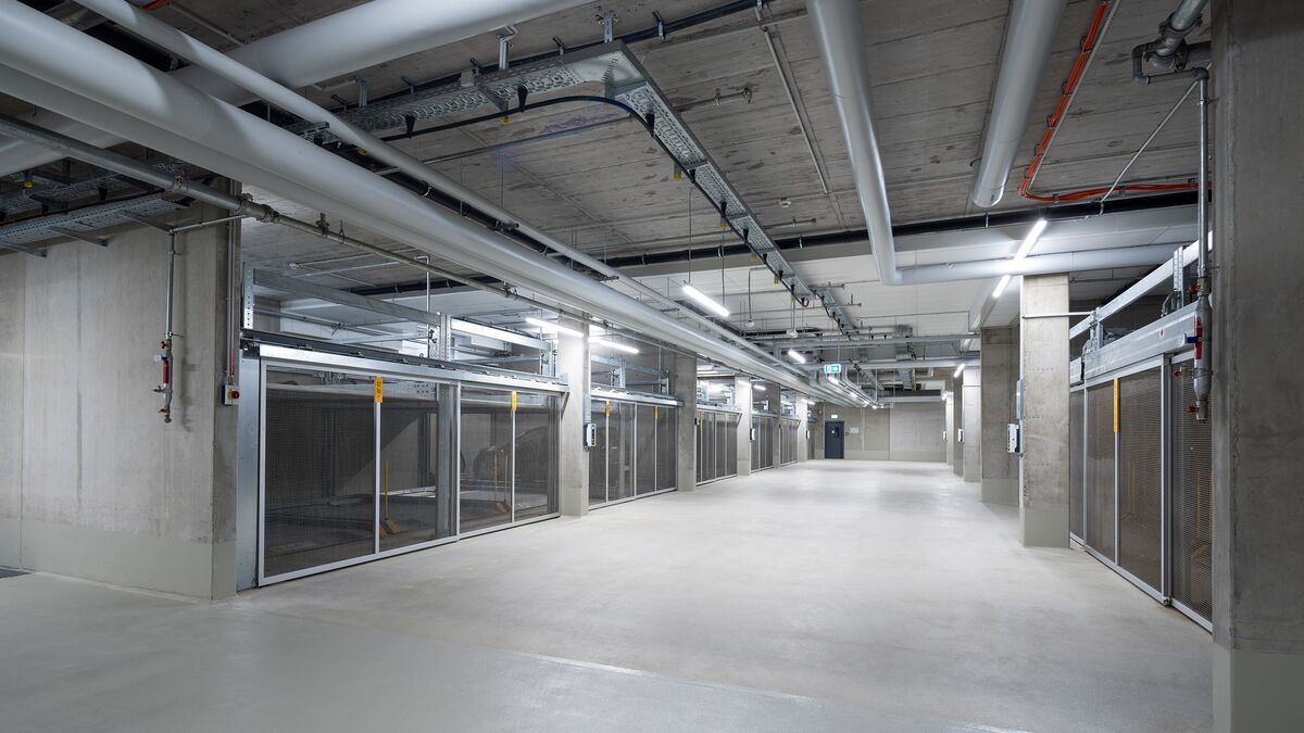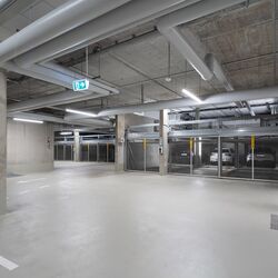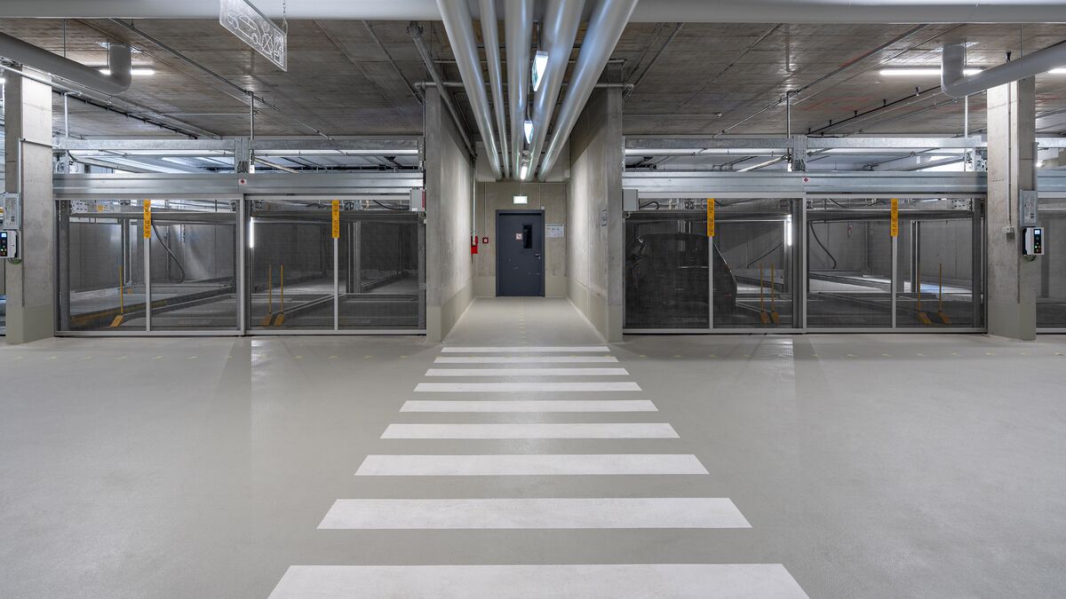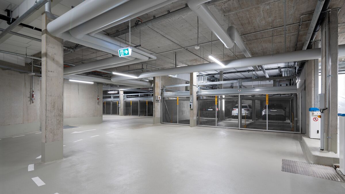 De las 171 plazas de aparcamiento que hay en total en el barrio, 124 están alojadas en los sistemas WÖHR Combilift de las variantes 543 y 552, que ahorran espacio. Distribuidas en 15 instalaciones con diferentes tamaños de rejilla, ofrecen a los residentes plazas de aparcamiento cómodas y eficientes, adaptadas de forma óptima a las condiciones estructurales y a las necesidades del barrio.