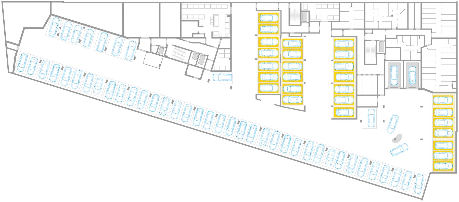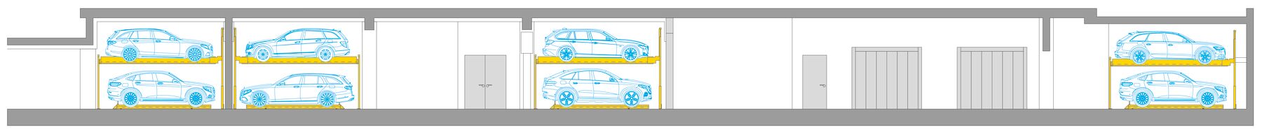 En el sótano se construyó un aparcamiento subterráneo común con casi 100 plazas, al que se accede mediante dos ascensores para coches. 50 plazas están dispuestas de forma compacta en cuatro sistemas semiautomáticos WÖHR Combilift 551. Además, hay plazas disponibles para el uso compartido de vehículos. La reducción de la ratio de plazas de aparcamiento a 0,4 por unidad residencial y el uso de los sistemas compactos WÖHR respaldan la estrategia de movilidad sostenible del barrio y contribuyen a la reducción de los costes de construcción.