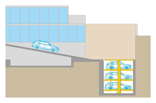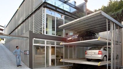 Como corresponde a un proyecto ecológico, los elevadores de estacionamiento también se equiparon con estaciones de carga eléctrica. El revestimiento de la placa de cubierta se adaptó al revestimiento del suelo de la zona exterior para que los elevadores de estacionamiento sean invisibles fuera de los procesos de aparcamiento. Lo más destacado del proyecto es que la cubierta de hormigón de los elevadores funciona como intercambiador de calor geotérmico, con el que se puede obtener energía adicional para la climatización del edificio. Una idea 'cool' para un aparcamiento relajado bajo el cálido sol de Madrid.