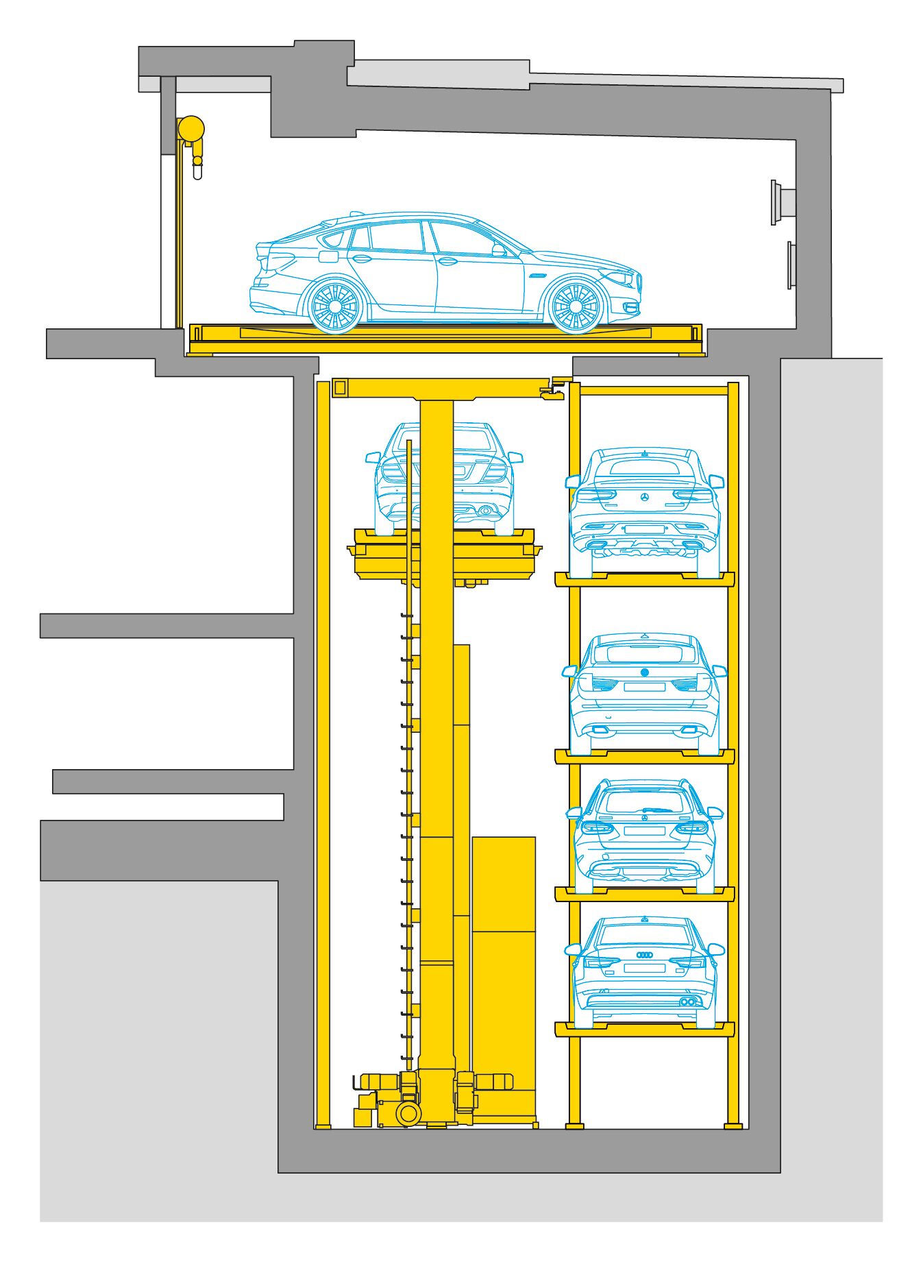 La situación del aparcamiento suponía un reto especial, ya que el terreno estaba completamente edificado. La solución vino de la mano de WÖHR Autoparksysteme GmbH: el Multiparker 740 permite el aparcamiento totalmente automático de 28 vehículos en cuatro niveles subterráneos, ahorrando espacio y siendo eficiente. Los usuarios aparcan su vehículo a nivel del suelo en una zona de transferencia luminosa y moderna en el interior del edificio. Una plataforma giratoria integrada garantiza una entrada y salida cómodas en el sentido de la marcha. El vehículo se transporta en una paleta a la estantería alta subterránea, controlada mediante un elemento de mando con chip RFID.