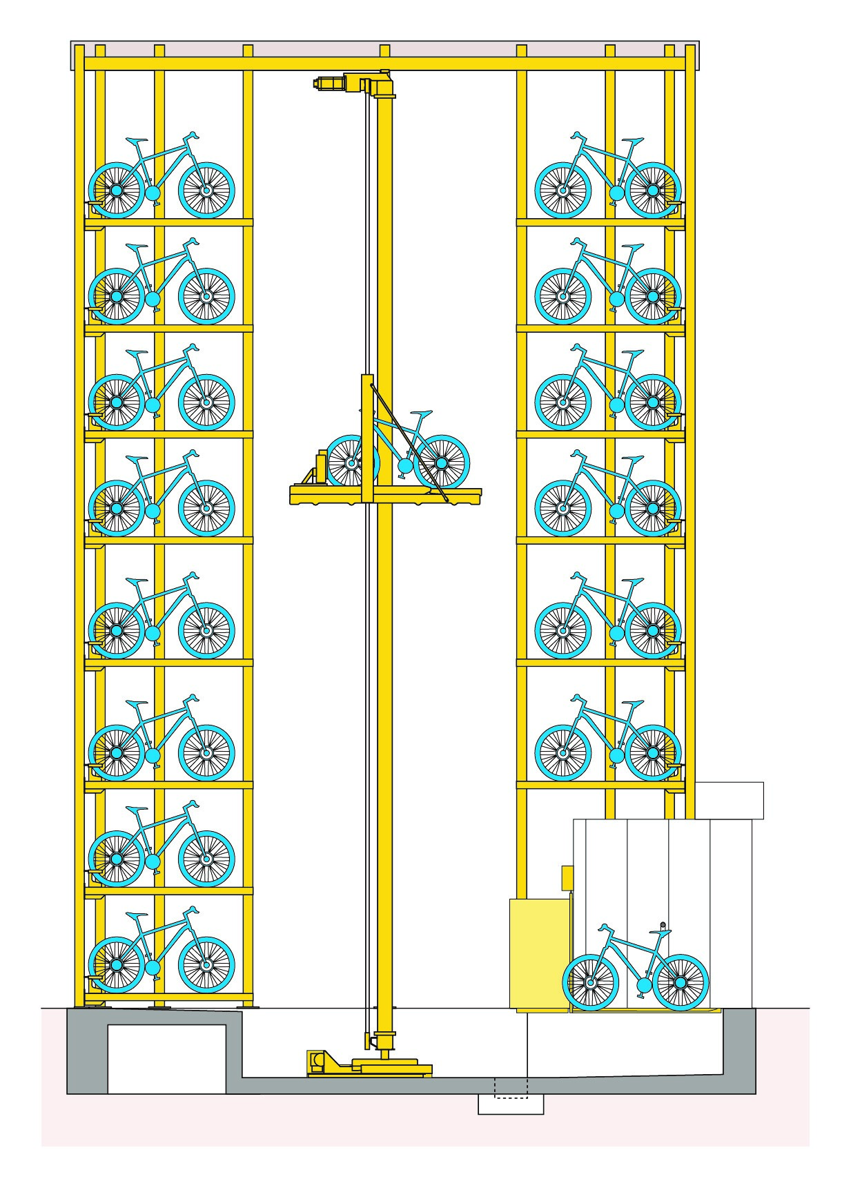 En el Sistema WÖHR Bikesafe, la bicicleta se entrega en la zona de transferencia donde el sistema la recoge y la almacena de forma totalmente automática, en una torre cerrada de varios pisos. Los usuarios simplemente colocan la bicicleta hacia en un riel colocado en el suelo de la zona de transferencia. Aquí, los sensores comprueban del peso y las dimensiones. En la variante de Reutlingen, se pueden almacenar bicicletas con un ancho de manillar de hasta 83 cm. La autorización se realiza mediante la identificación del empleado en la zona de transferencia. A continuación, un brazo robotizado transporta la bicicleta a una plaza de aparcamiento libre en uno de los ocho niveles. La recogida de la bicicleta también es fácil: el tiempo de espera hasta la entrega de una bicicleta almacenada es de solo unos 16 segundos.