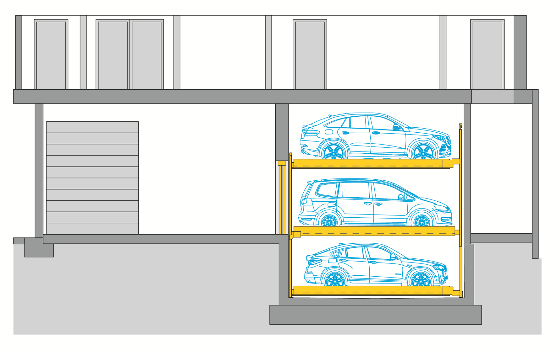 El Combilift 543 es un sistema de aparcamiento semiautomático. El principio básico del Combilift 543 es que hay un nivel en un foso, un nivel en la superficie de conducción y un nivel por encima. 3 niveles y todos los coches pueden aproximarse individualmente sin tener que retirar en ningún momento otro coche del sistema. Moviendo las plazas de aparcamiento, es posible aparcar en todas plazas de forma totalmente independiente. Las plataformas anchas (270 cm) hacen que aparcar y desaparcar resulte especialmente cómodo.