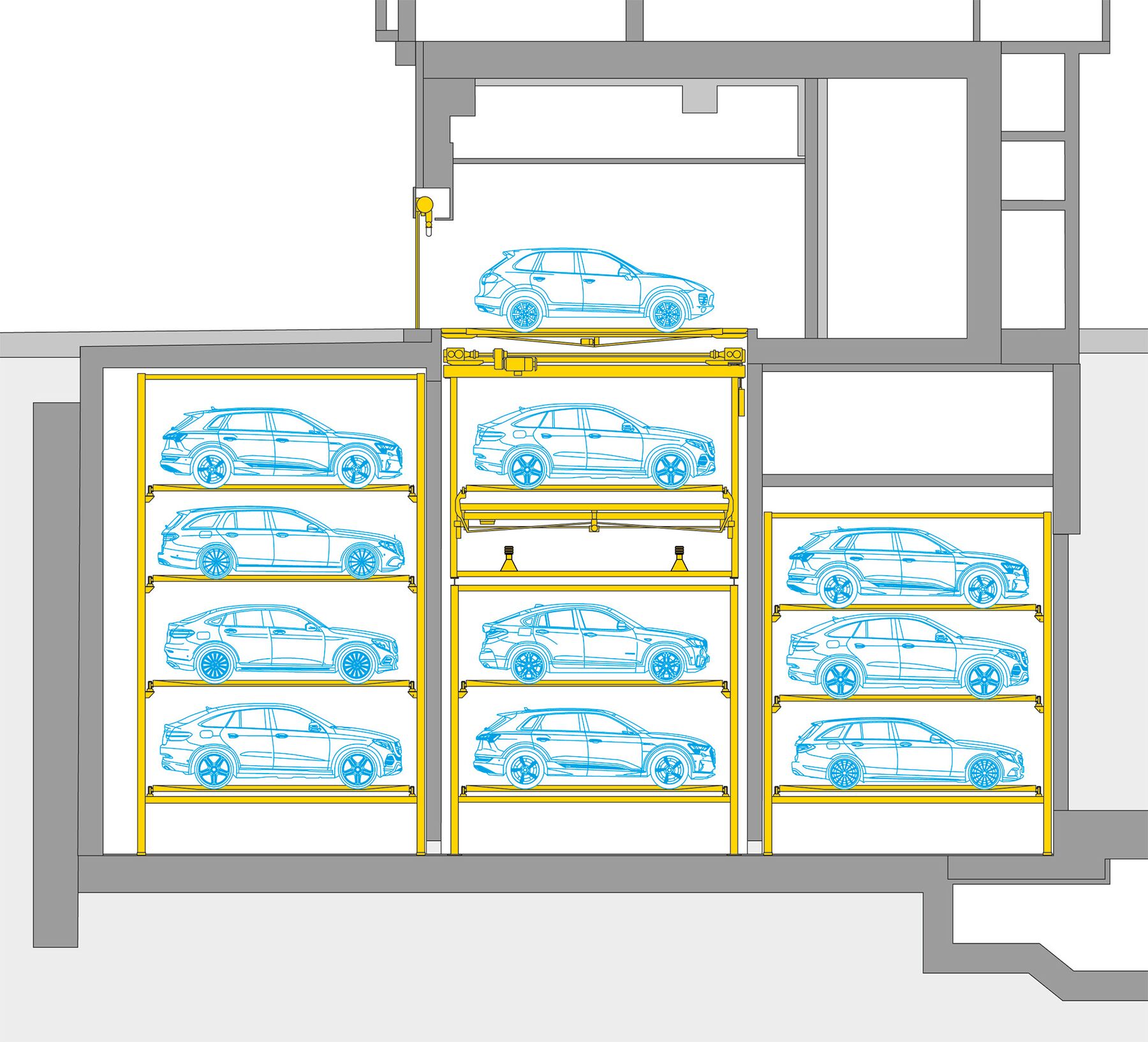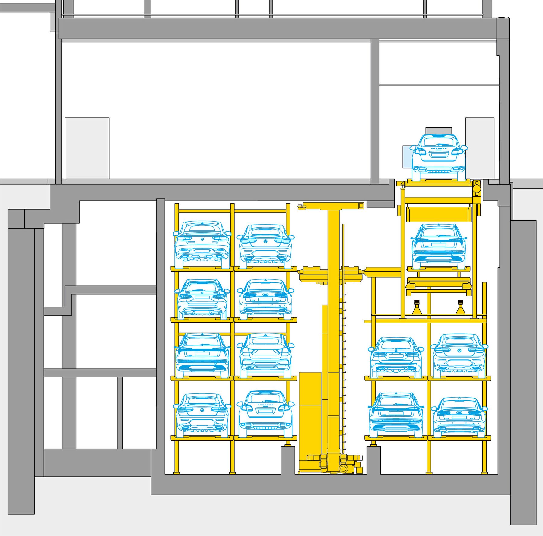La Torre Franklin también cumple importantes funciones de espacio público. Además de la rampa de acceso al garaje público para bicicletas, en la planta baja de la torre también tienen lugar las entregas a y desde la ShopVille de la estación. El sistema de aparcamiento adyacente «WÖHR Multiparker 740» integra eficazmente 38 plazas de aparcamiento para los inquilinos del edificio. Una vez aparcados en la cabina de transferencia, los vehículos se retiran automáticamente en un plazo aproximado de 139 a 222 segundos y se estacionan en el almacén de gran altura de cuatro plantas situado en el sótano. En función de la altura del vehículo, se dispone de 21 plazas de aparcamiento de hasta un máximo de 2,00 m y 17 plazas de aparcamiento de hasta 1,70 m para pesos de vehículo de hasta un máximo de 3,00 toneladas. El dispositivo de giro de 360° de la cabina de transferencia permite aparcar y recoger cómodamente en el sentido de la marcha.